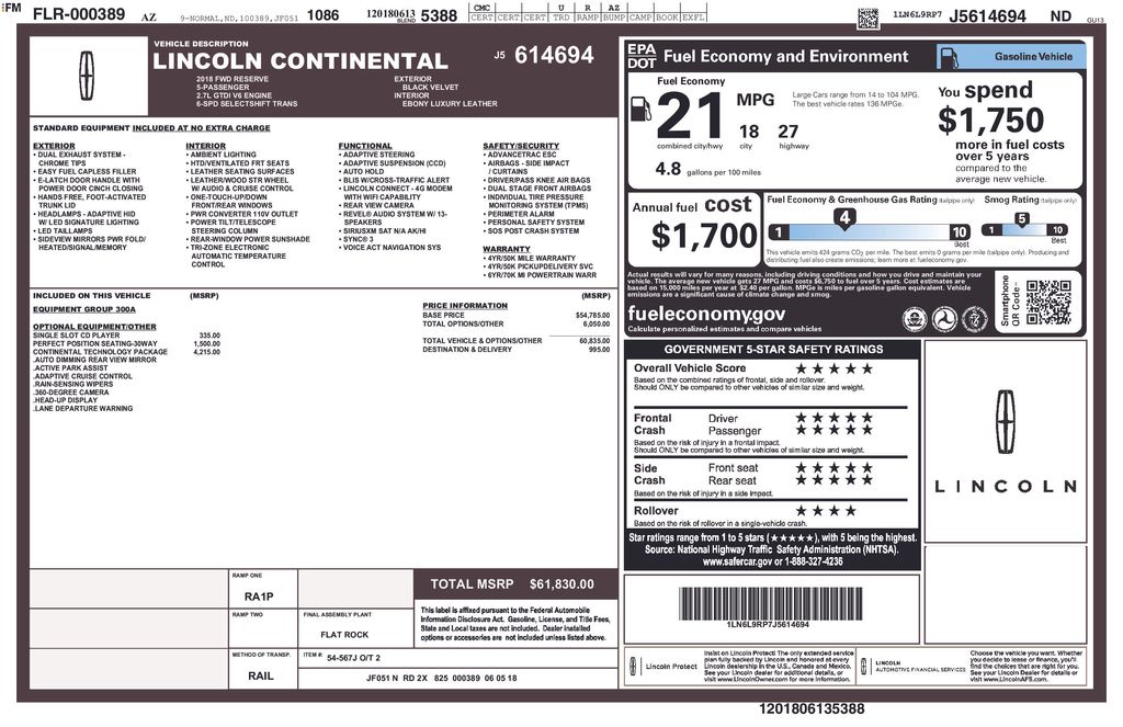This Lincoln Continental is equipped with the following features: Continental Technology Package (360-degree Camera, Active Park Assist, Adaptive Cruise Control, Auto-Dimming Rear-View Mirror, Head-Up Display, Lane Keeping System, Pre-Collision Assist w/Pedestrian Detection, Rain-Sensing Wipers, and Windshield Wiper De-Icer), Equipment Group 300A, 13 Speakers, 19" Polished Aluminum Wheels, 4-Wheel Disc Brakes, ABS brakes, Adaptive suspension, Air Conditioning, Alloy wheels, AM/FM radio: SiriusXM, AppLink/Apple CarPlay and Android Auto, Auto tilt-away steering wheel, Auto-dimming door mirrors, Automatic temperature control, Brake assist, Bumpers: body-color, Compass, Delay-off headlights, Door auto-latch, Driver door bin, Driver vanity mirror, Dual front impact airbags, Dual front side impact airbags, Electronic Stability Control, Emergency communication system: 911 Assist, Exterior Parking Camera Rear, Four wheel independent suspension, Front anti-roll bar, Front Bucket Seats, Front Center Armrest, Front dual zone A/C, Front reading lights, Fully automatic headlights, Garage door transmitter, Genuine wood console insert, Genuine wood dashboard insert, Genuine wood door panel insert, Heated door mirrors, Heated front seats, High-Intensity Discharge Headlights, Illuminated entry, Knee airbag, Leather steering wheel, Low tire pressure warning, Luxury Leather Heated/Cooled Front Seat, Memory seat, Navigation System, Occupant sensing airbag, Outside temperature display, Overhead airbag, Overhead console, Panic alarm, Passenger door bin, Passenger vanity mirror, Perfect Position Seating w/Active Motion, Power adjustable front head restraints, Power door mirrors, Power driver seat, Power passenger seat, Power steering, Power windows, Radio data system, Radio: Revel Audio System w/13 Speakers, Rear air conditioning, Rear anti-roll bar, Rear reading lights, Rear seat center armrest, Rear Window Blind, Rear window defroster, Remote keyless entry, Security system, Single-CD player, SiriusXM Radio, Speed control, Speed-sensing steering, Split folding rear seat, Steering wheel memory, Steering wheel mounted A/C controls, Steering wheel mounted audio controls, SYNC 3 Communications & Entertainment System, Tachometer, Telescoping steering wheel, Tilt steering wheel, Traction control, Trip computer, Turn signal indicator mirrors, Variably intermittent wipers, and Ventilated front seats.