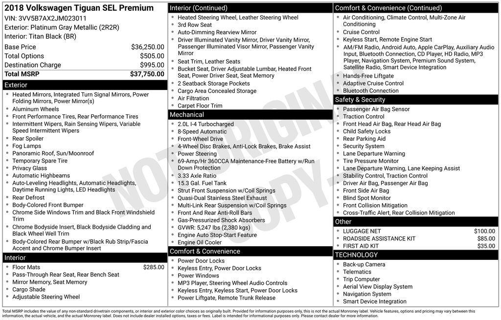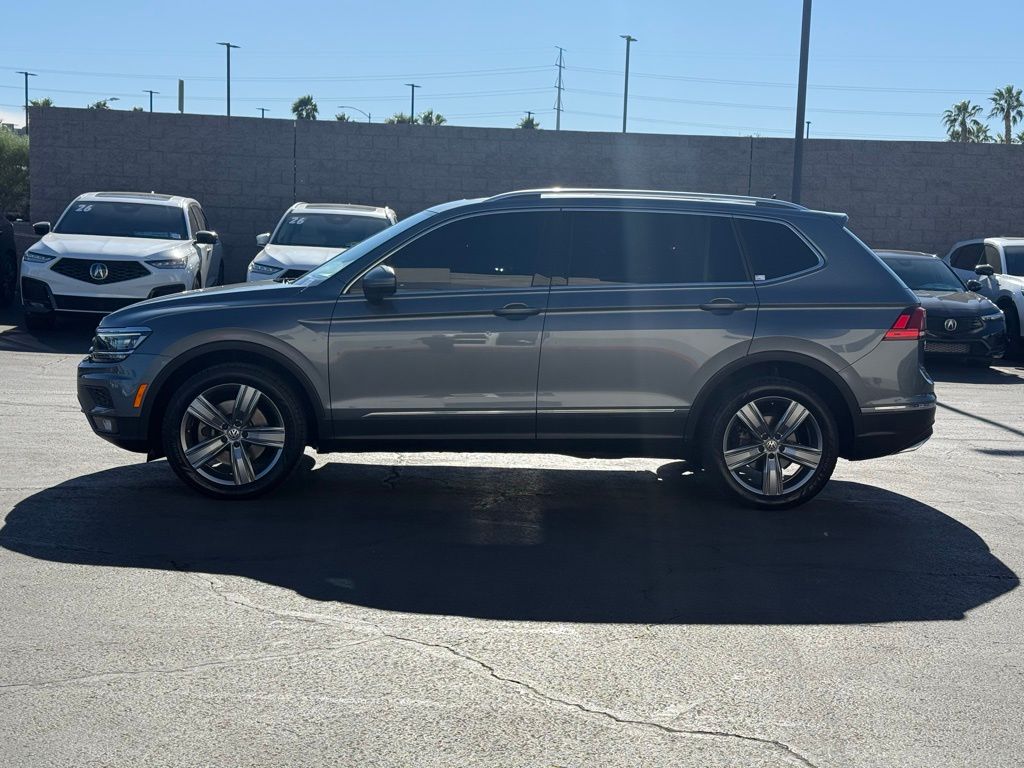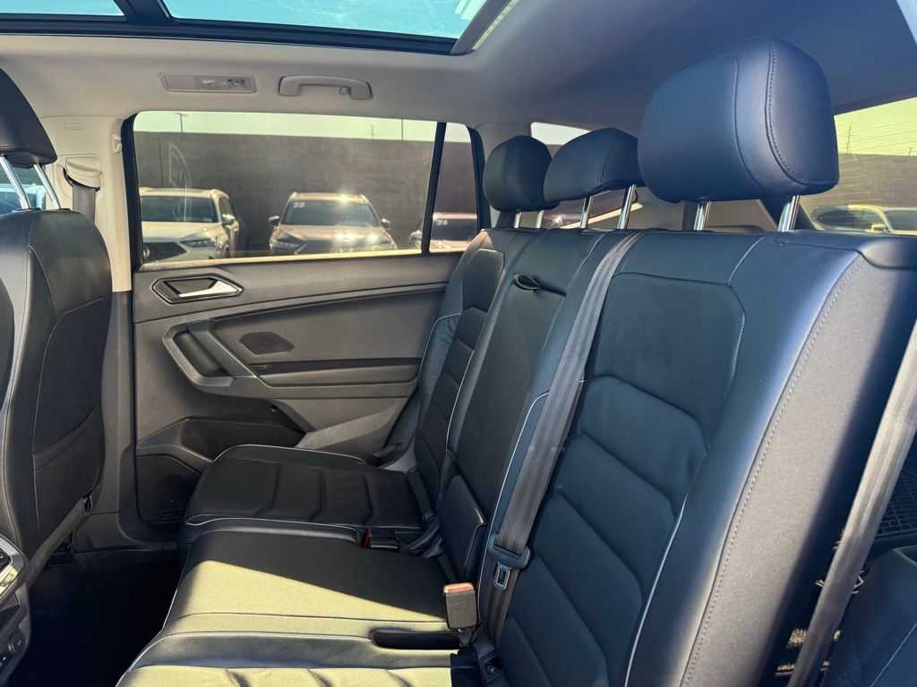 This Volkswagen Tiguan is equipped with the following features: 3-Row Rubber Mats Kit, 3.33 Axle Ratio, 3rd row seats: bench, 4-Wheel Disc Brakes, 9 Speakers, ABS brakes, Air Conditioning, Alloy wheels, AM/FM radio: SiriusXM, Auto High-beam Headlights, Auto-dimming Rear-View mirror, Automatic temperature control, Brake assist, Bumpers: body-color, Compass, Delay-off headlights, Driver door bin, Driver vanity mirror, Dual front impact airbags, Dual front side impact airbags, Electronic Stability Control, Emergency communication system: VW Car-Net, Exterior Parking Camera Rear, First Aid Kit, Four wheel independent suspension, Front anti-roll bar, Front Bucket Seats, Front Center Armrest, Front dual zone A/C, Front fog lights, Front reading lights, Fully automatic headlights, Heated door mirrors, Heated Front Bucket Seats, Heated front seats, Heated steering wheel, Illuminated entry, Leather Shift Knob, Low tire pressure warning, Luggage Net, Memory seat, Navigation System, Occupant sensing airbag, Outside temperature display, Overhead airbag, Overhead console, Panic alarm, Passenger door bin, Passenger vanity mirror, Power door mirrors, Power driver seat, Power Liftgate, Power moonroof, Power steering, Power windows, Radio data system, Radio: AM/FM/HD/CD w/Dual USB Inputs, Rain sensing wipers, Rear anti-roll bar, Rear reading lights, Rear seat center armrest, Rear window defroster, Rear window wiper, Remote CD player, Remote keyless entry, Roadside Assistance Kit, Roof rack: rails only, Security system, Speed control, Speed-sensing steering, Split folding rear seat, Spoiler, Steering wheel mounted audio controls, Tachometer, Telescoping steering wheel, Tilt steering wheel, Traction control, Trip computer, Turn signal indicator mirrors, Variably intermittent wipers, Vienna Leather Seating Surfaces, and Wheels: 19" Victoria Falls Alloy.